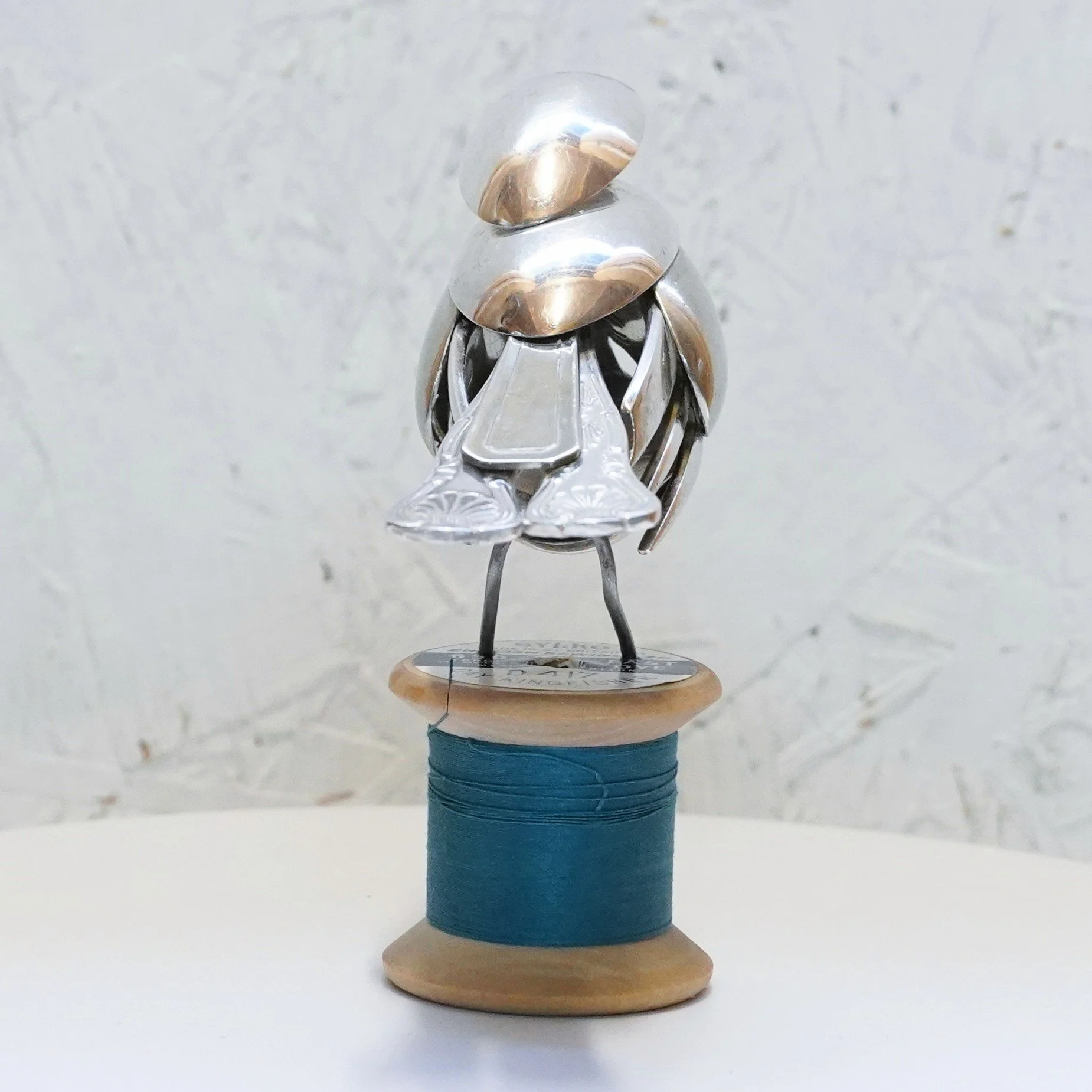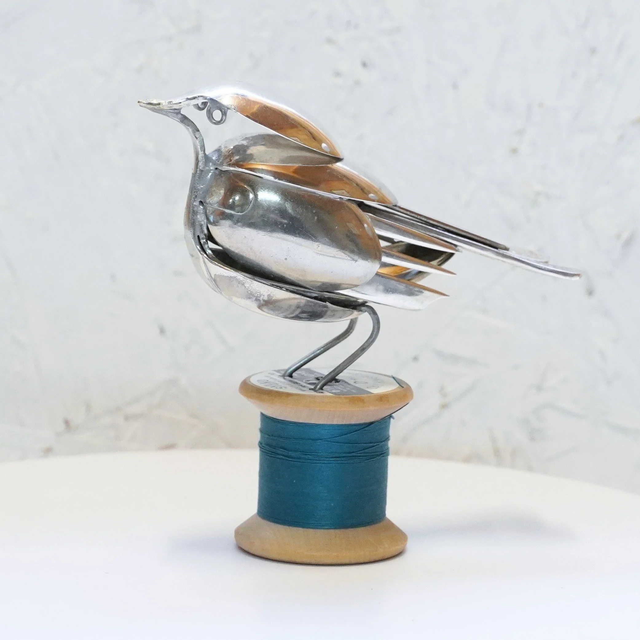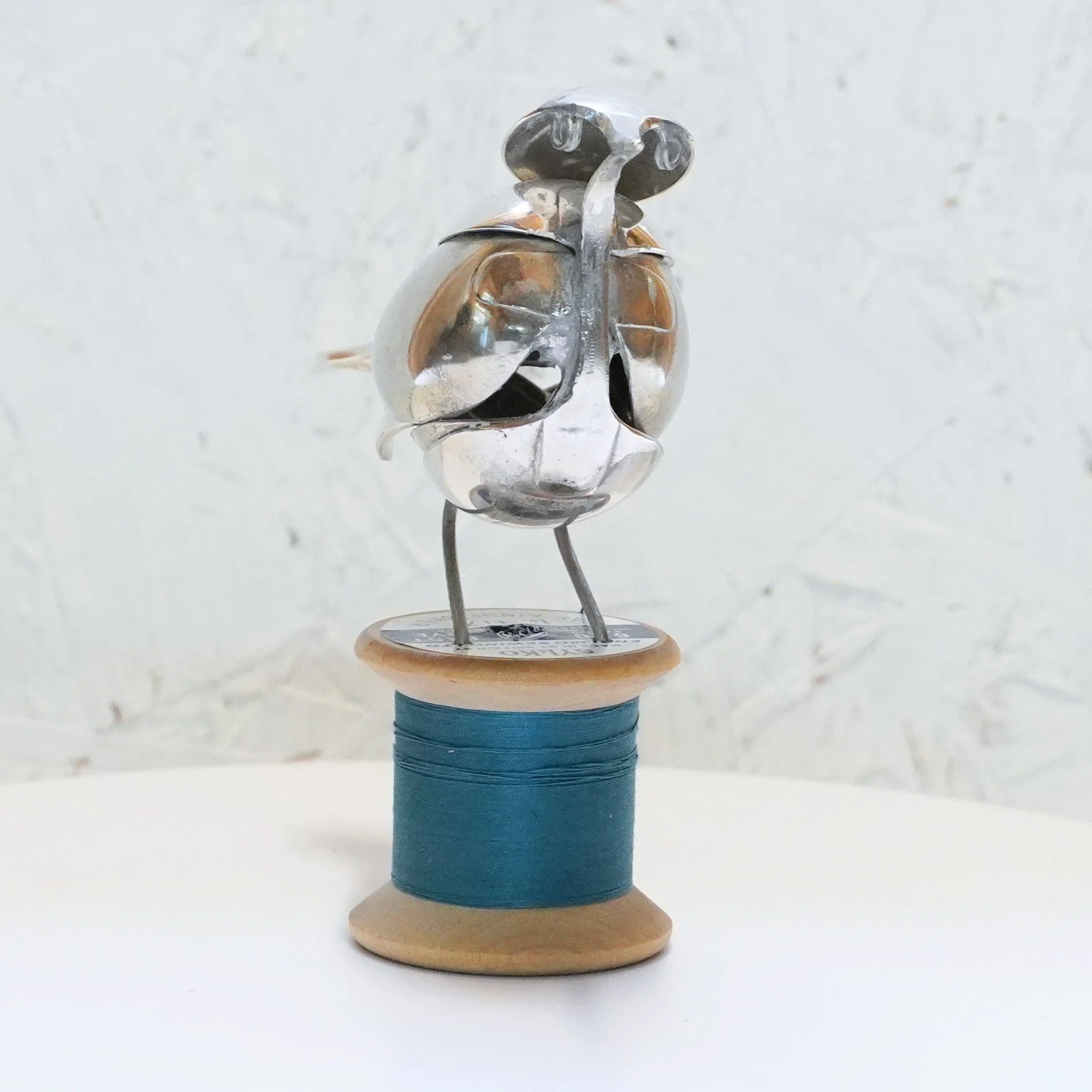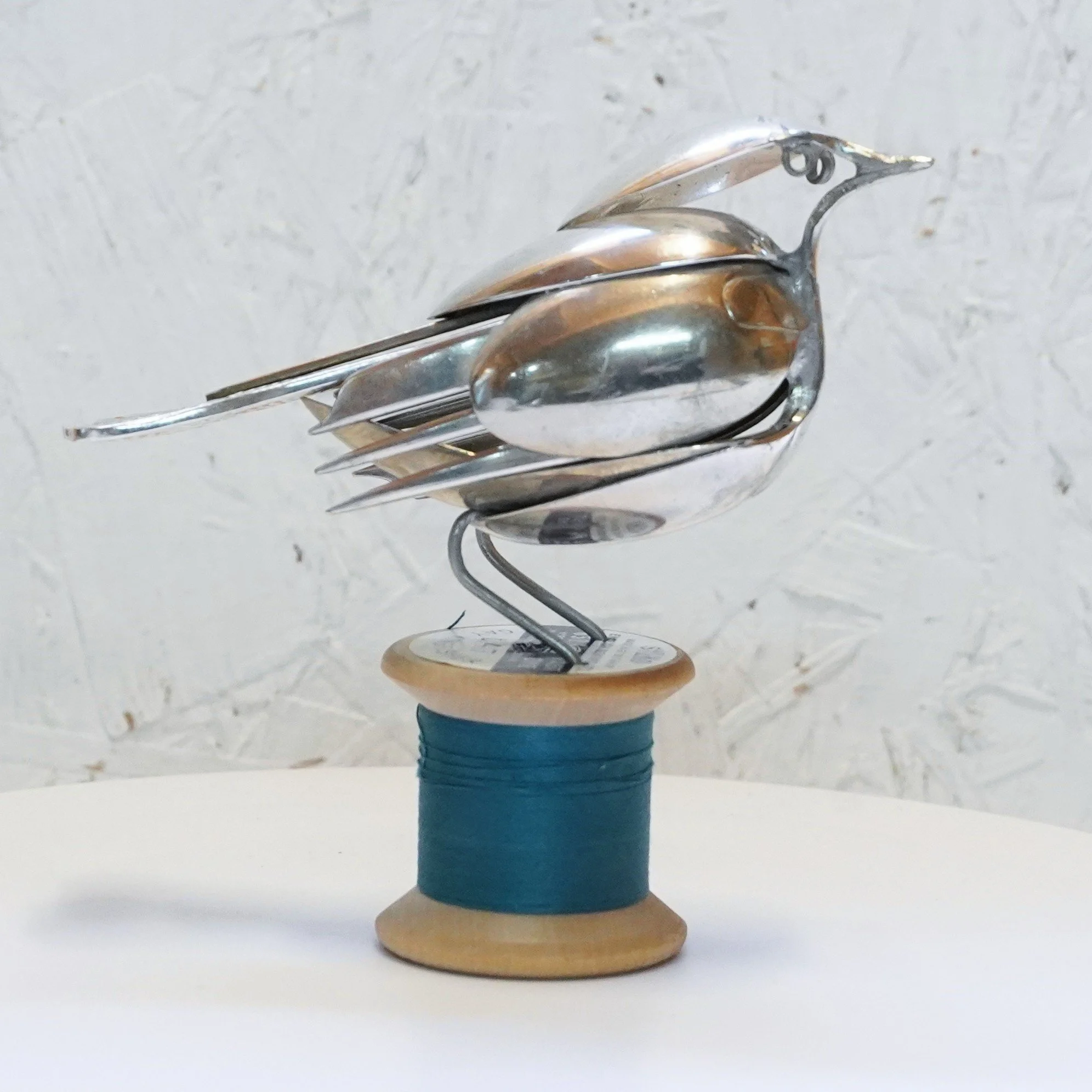 Robin created from vintage epns cutlery and mounted on a vintage wooden bobbin with ‘Gay KIngfisher’ cotton.