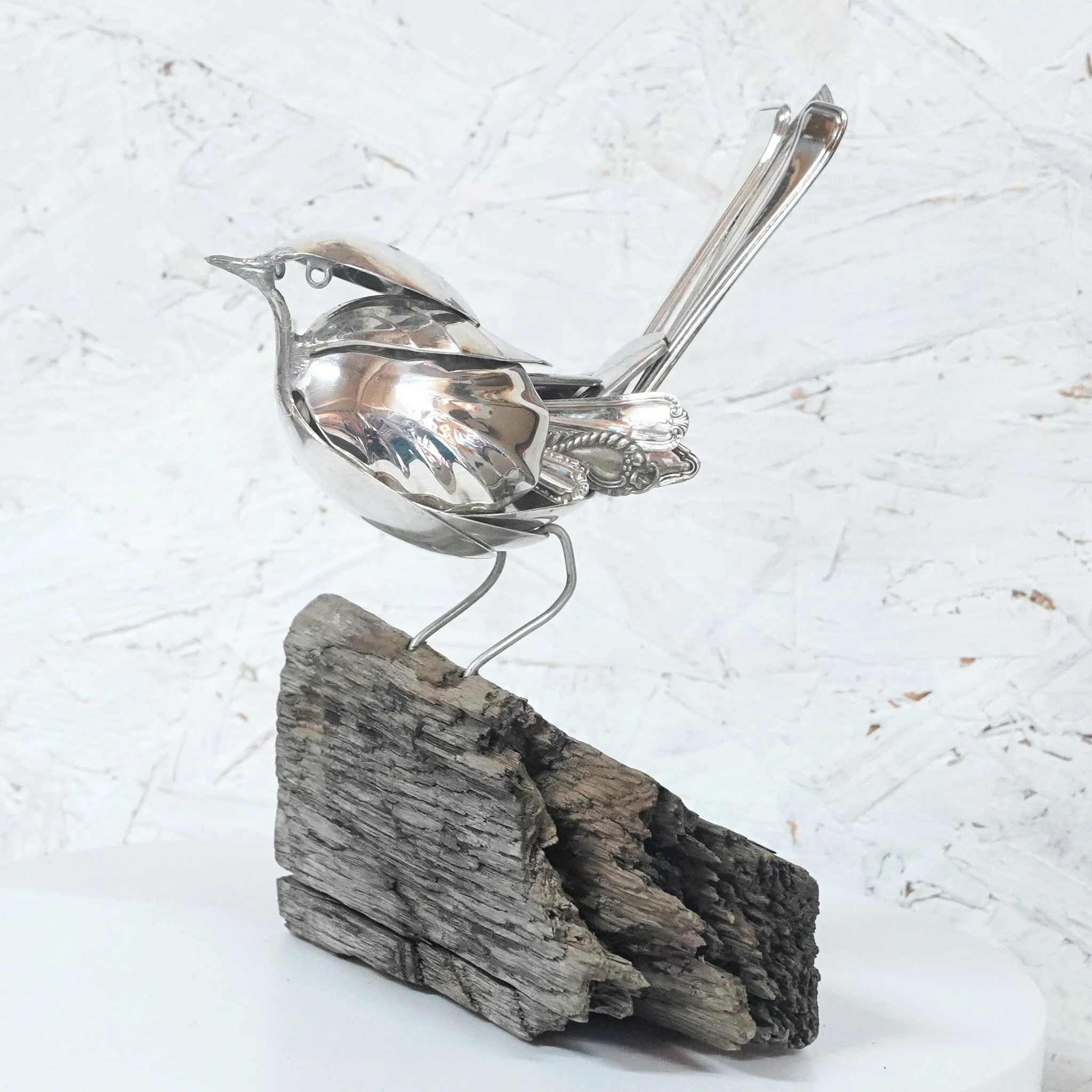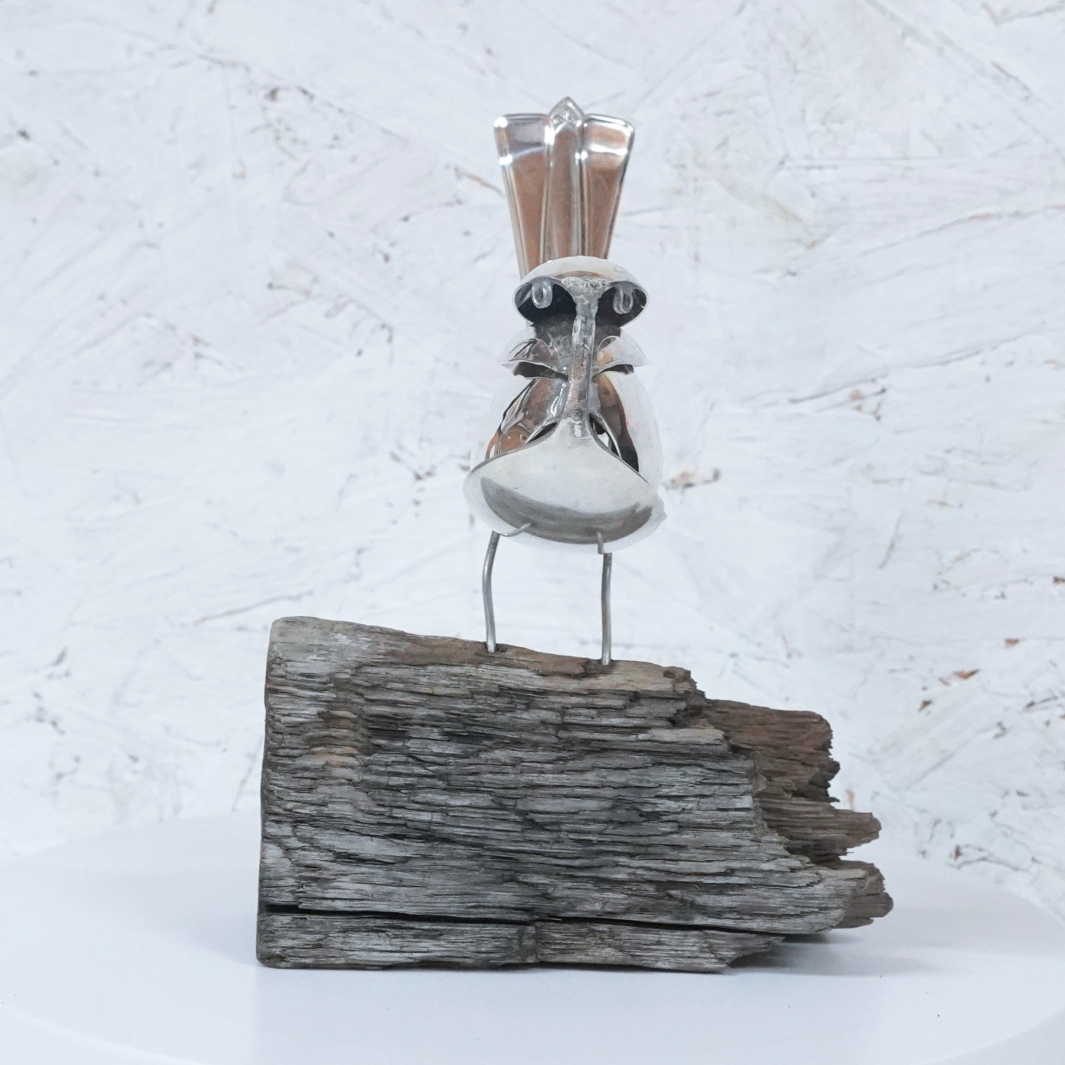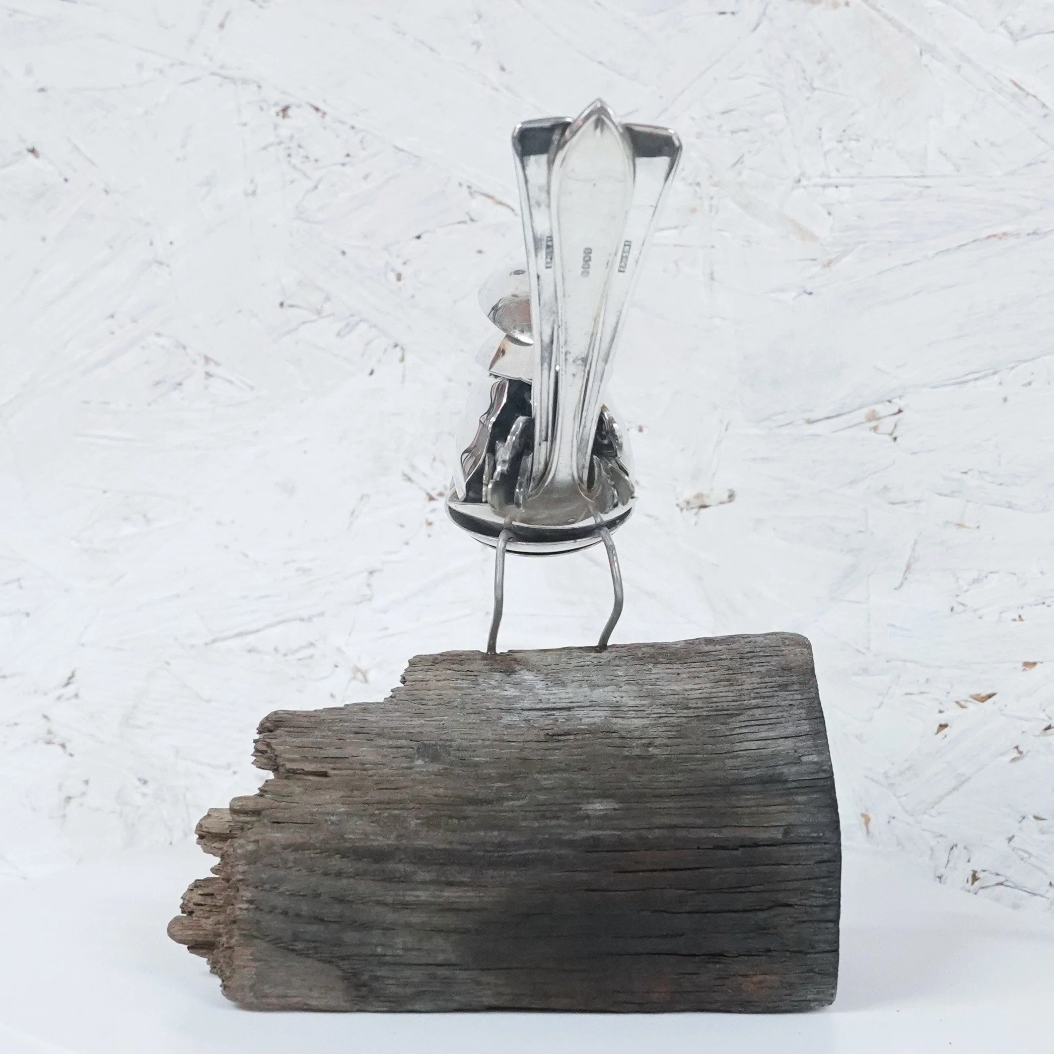 Blackbird created using epns / silver plated cutlery and mounted on driftwood