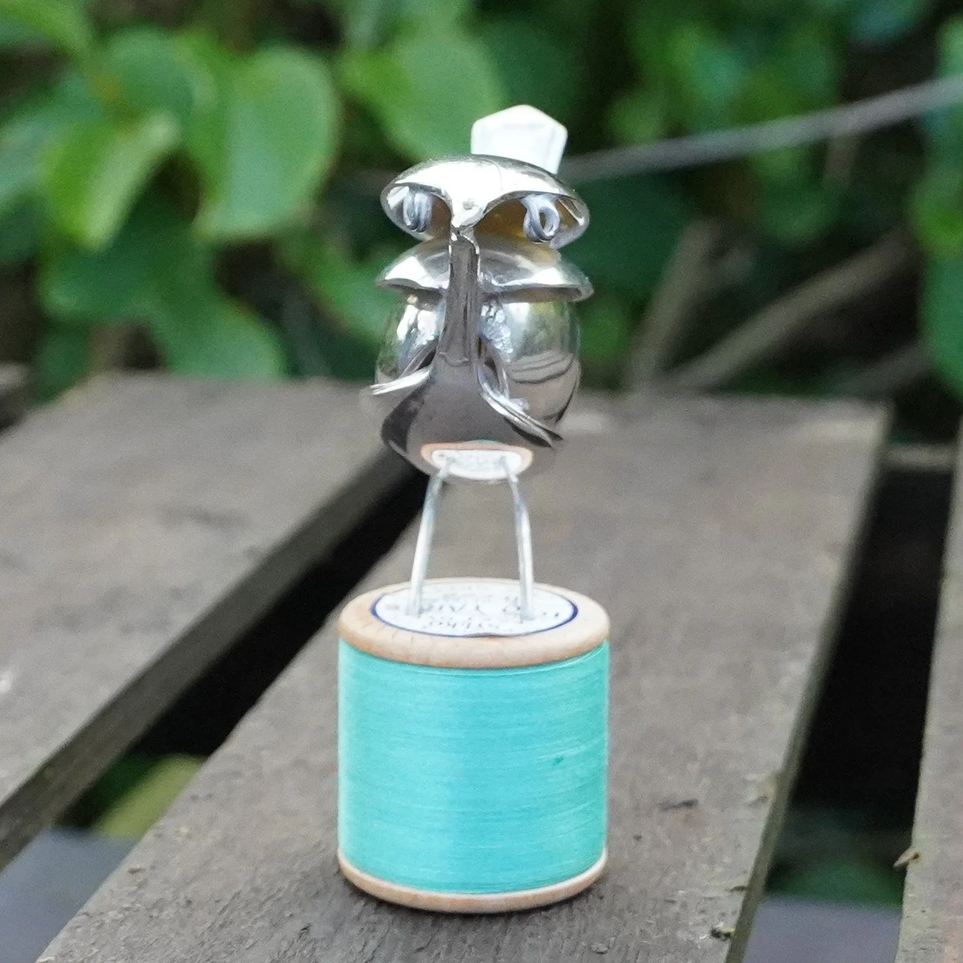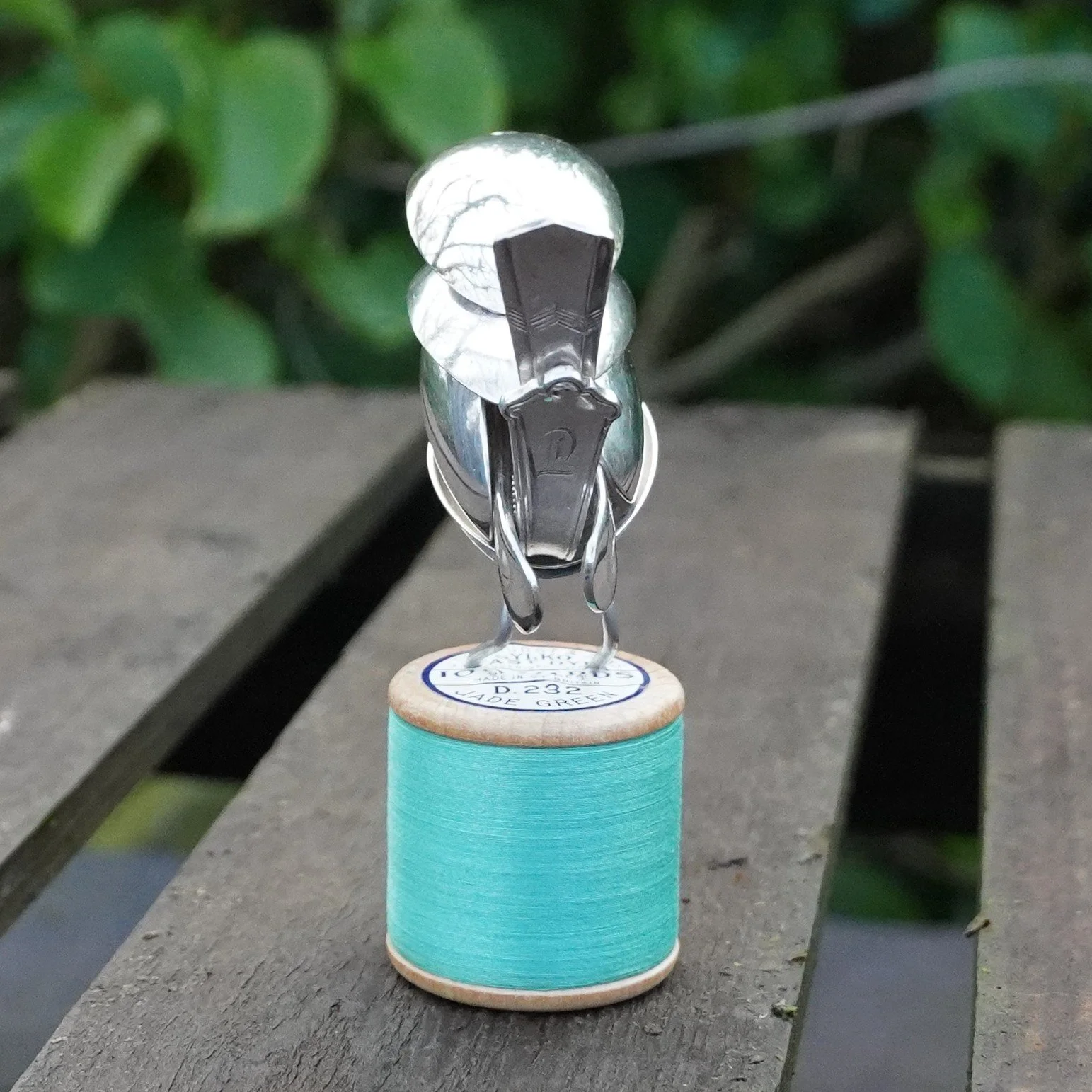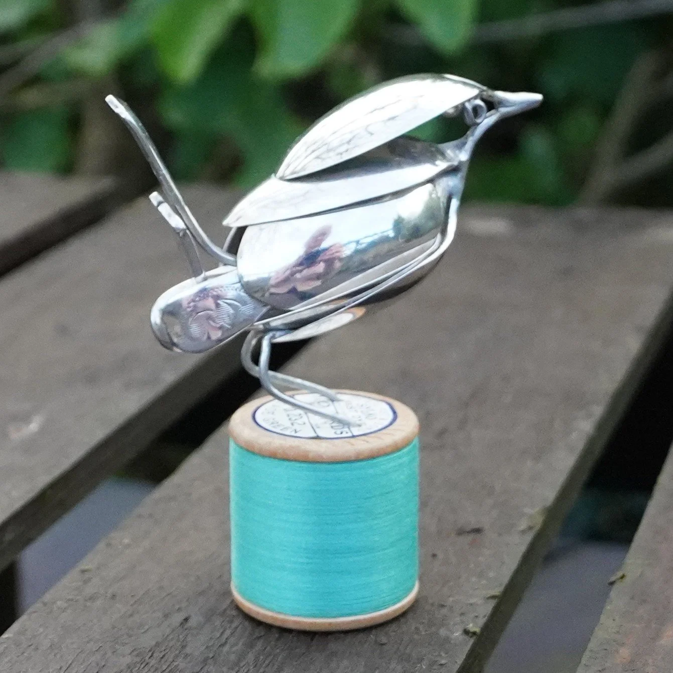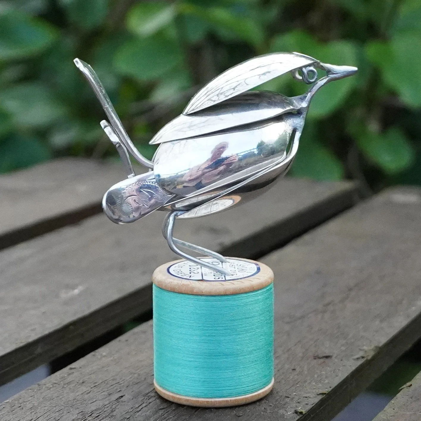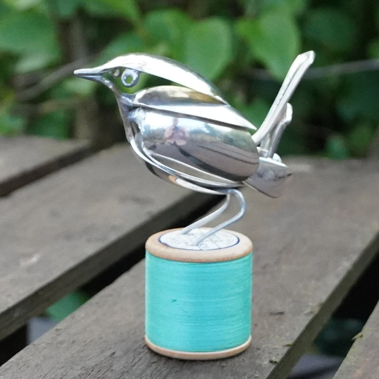 Wren created using epns / silver plated cutlery and mounted on vintage ‘Jade Green' cotton reel