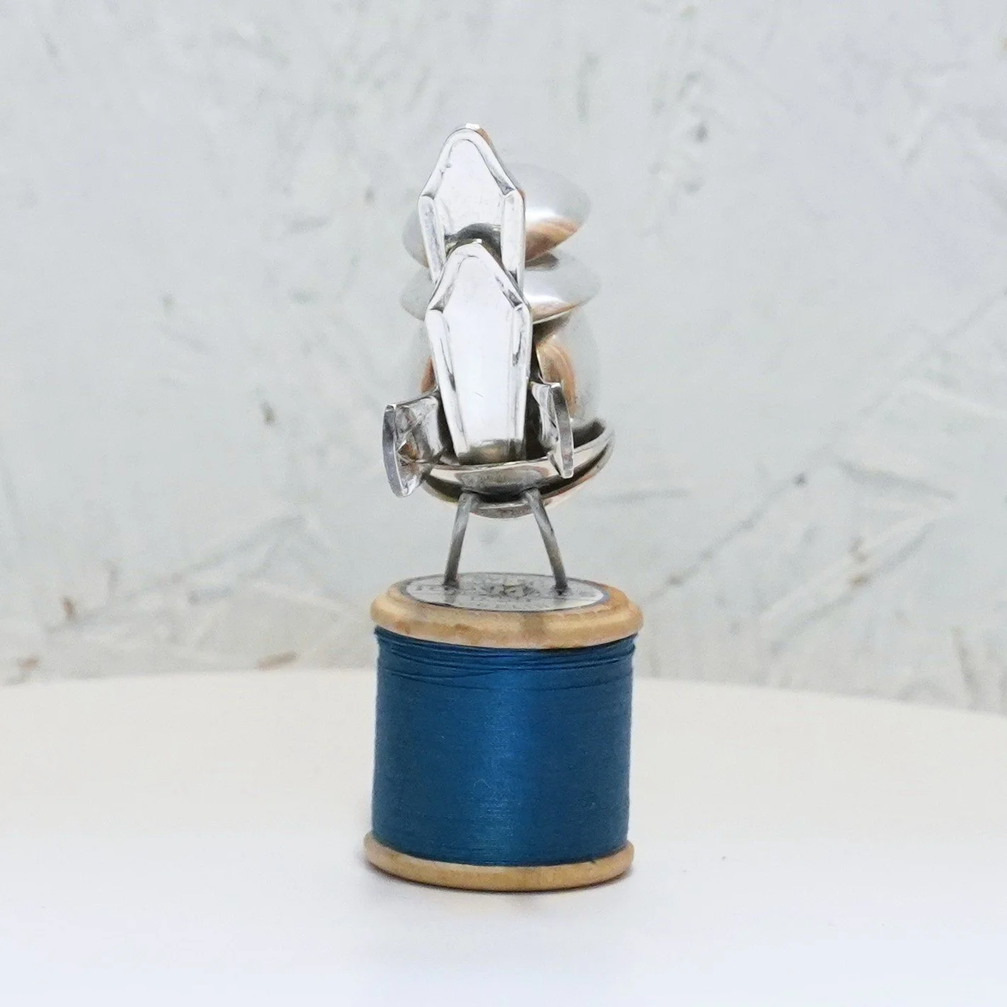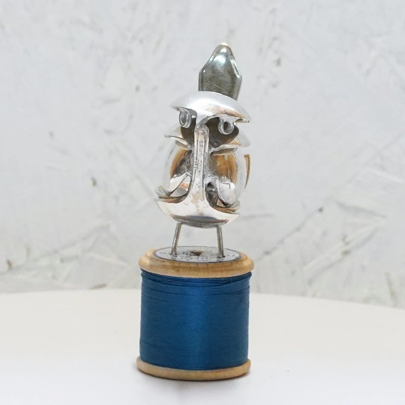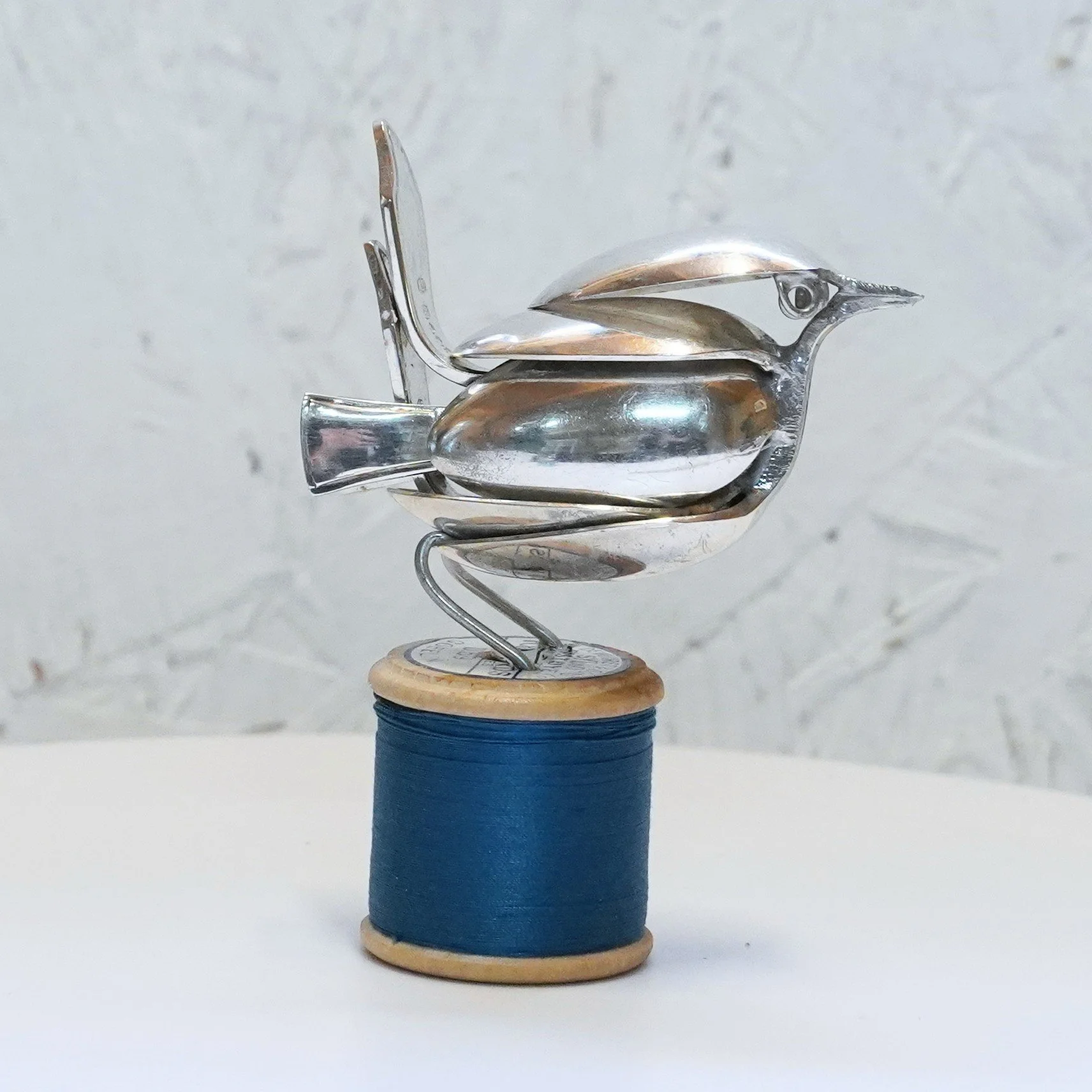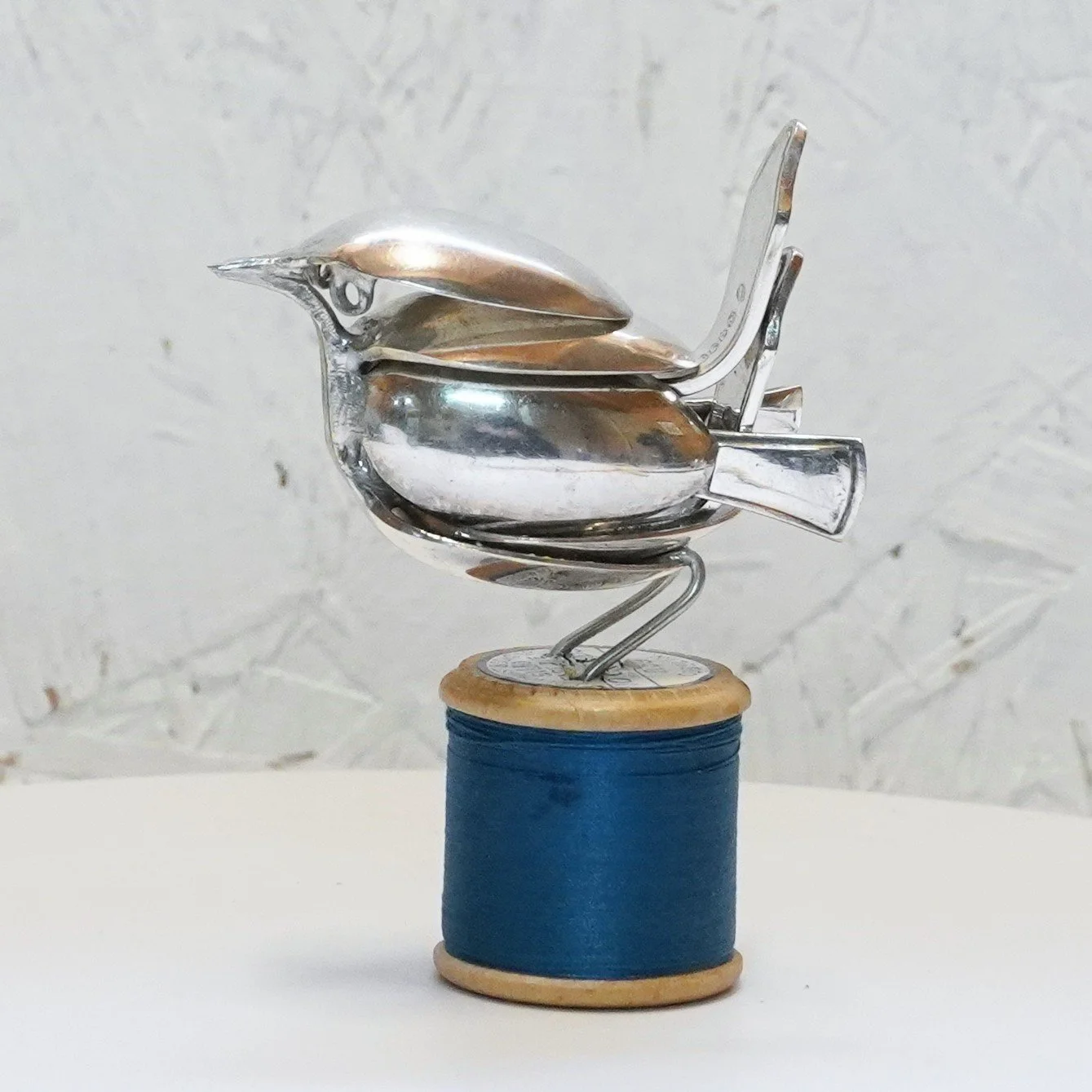 Wren created using epns / silver plated cutlery and mounted on vintage ‘Gobelin' cotton reel