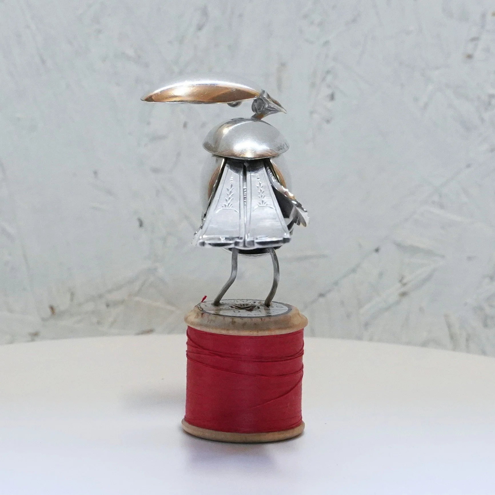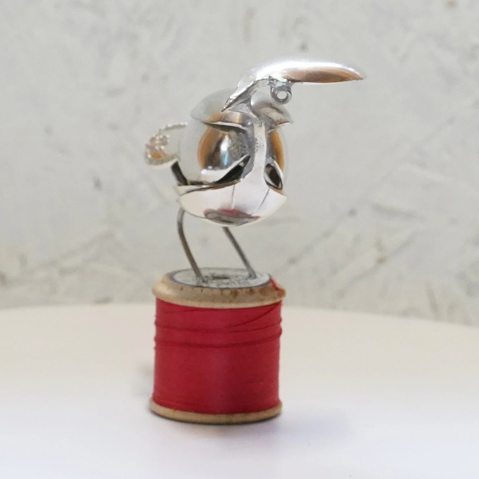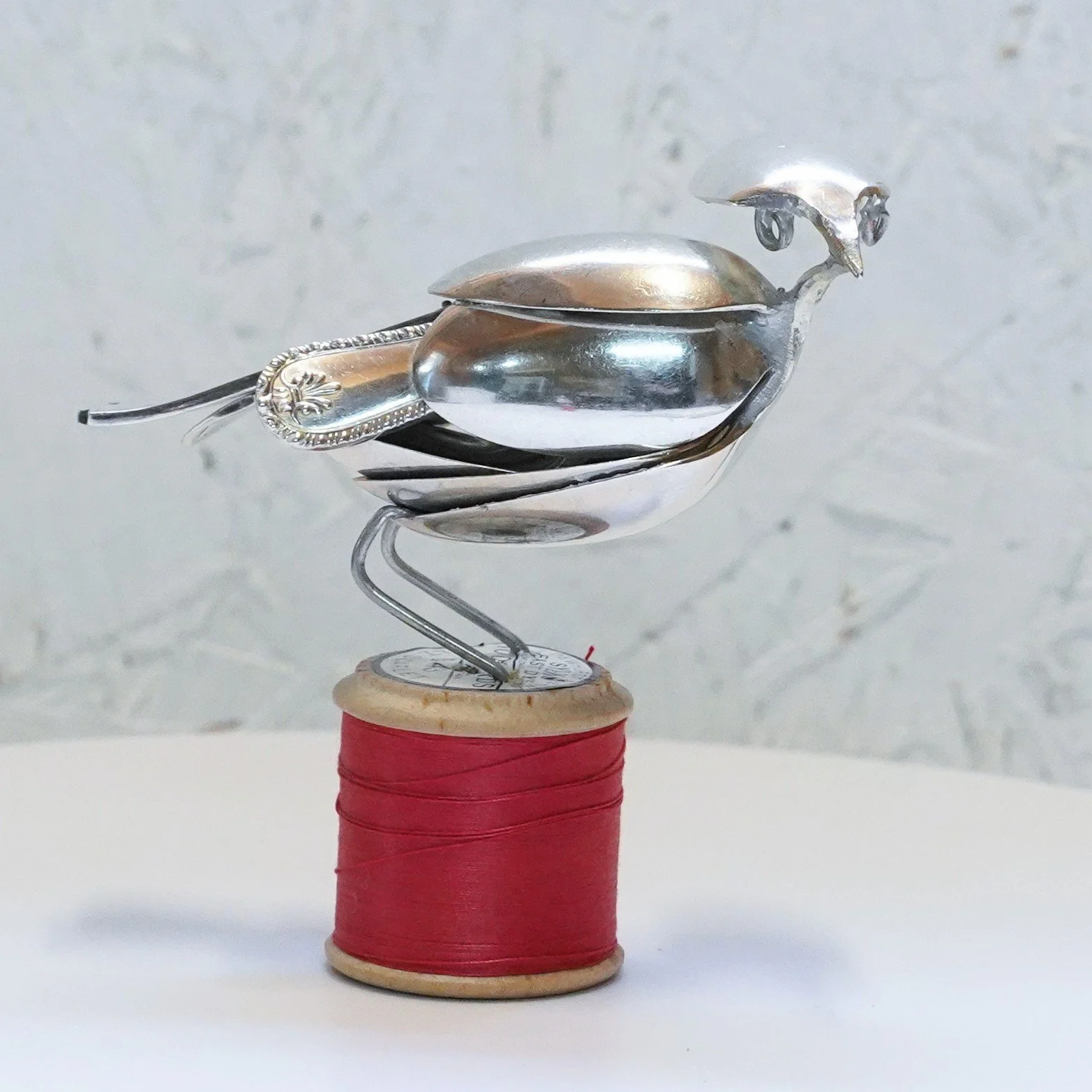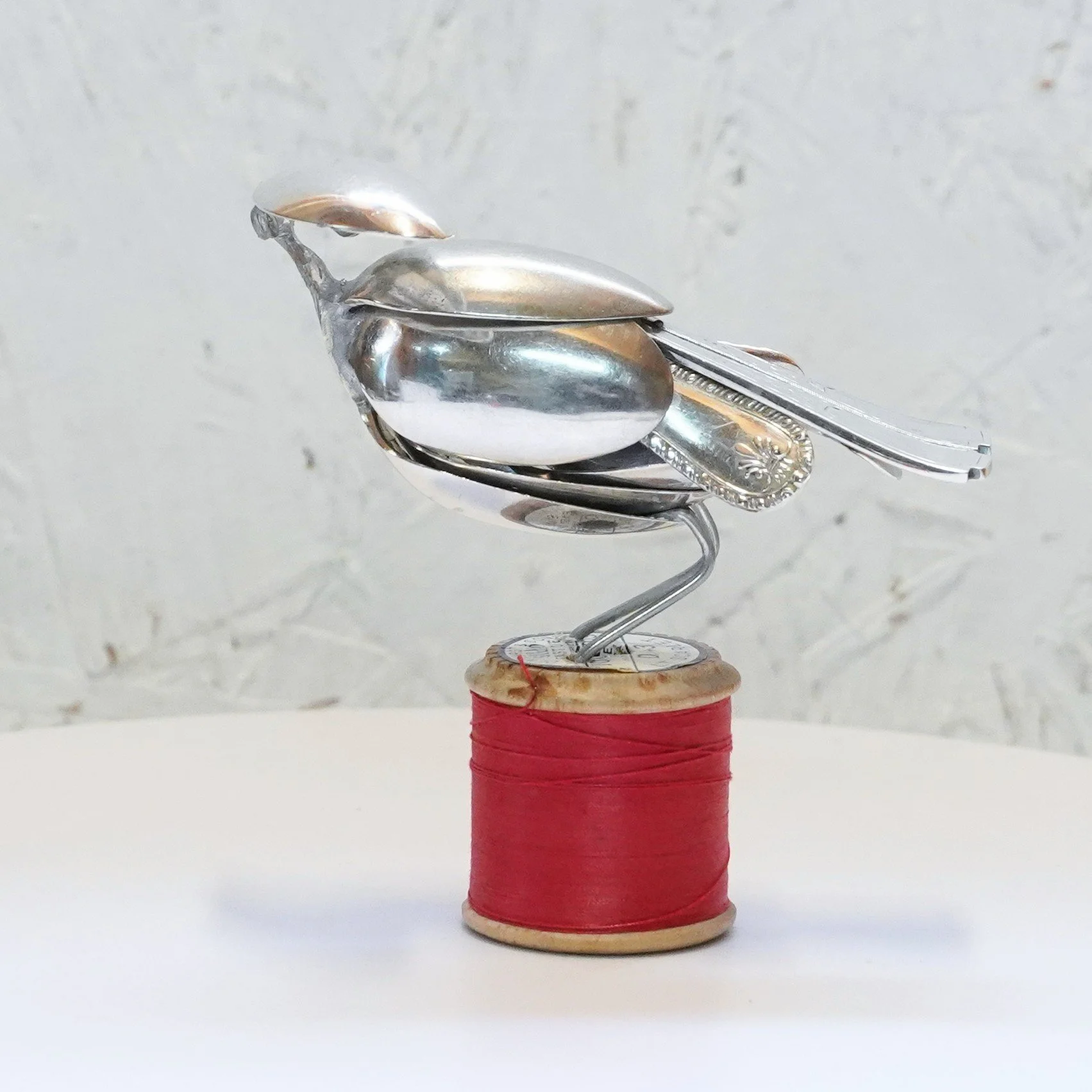 Great tit created using epns / silver plated cutlery and mounted on vintage ‘Lt Scarlett' cotton reel