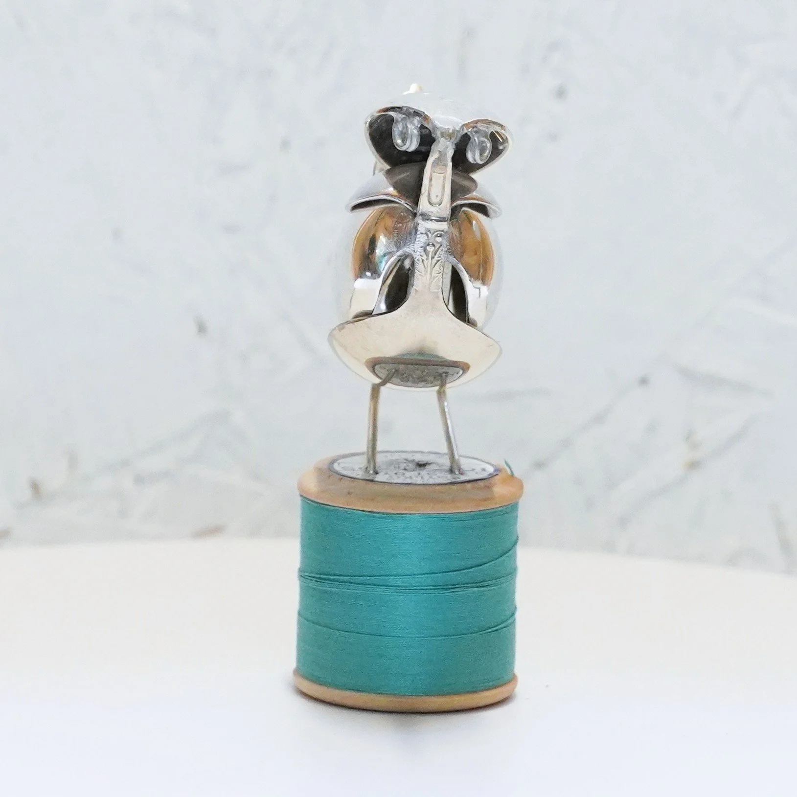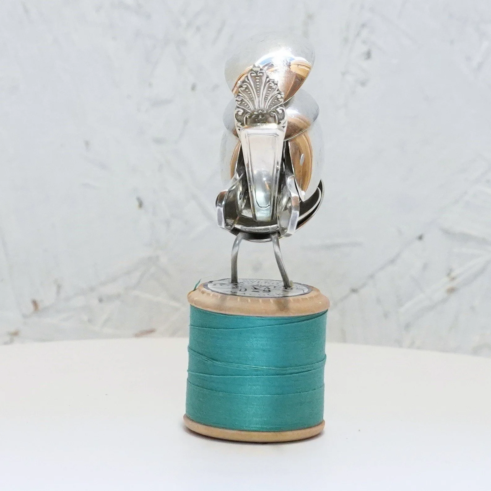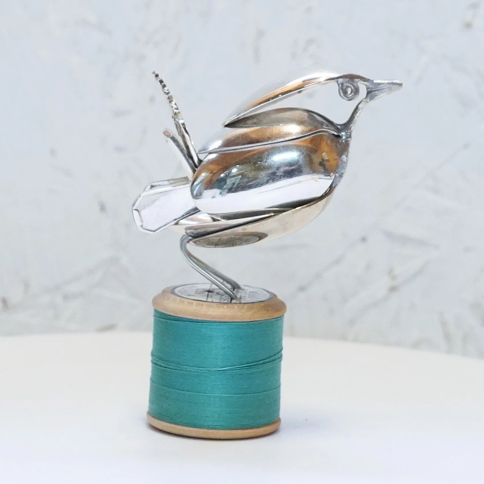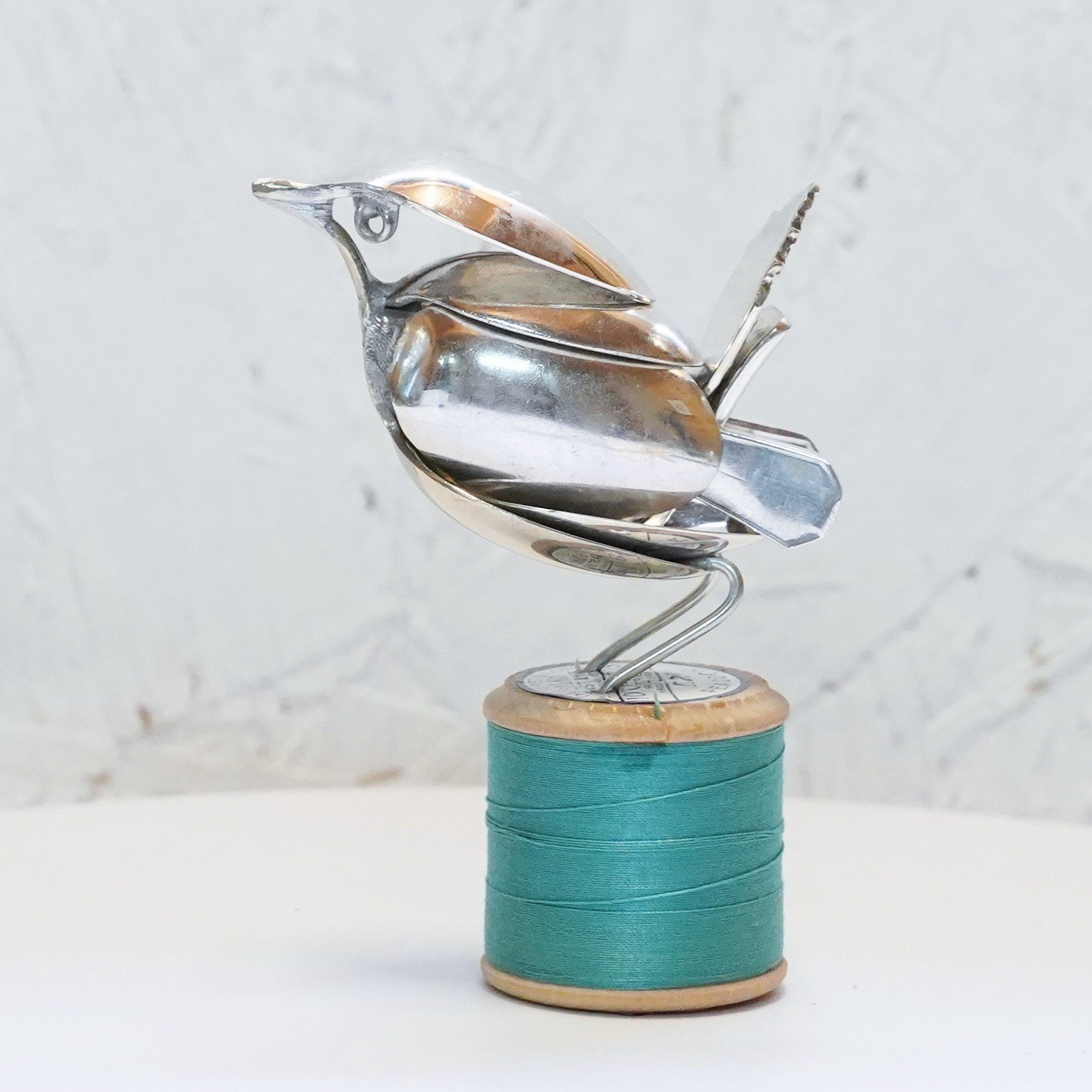 Wren created using epns / silver plated cutlery and mounted on vintage ‘Peacock' cotton reel