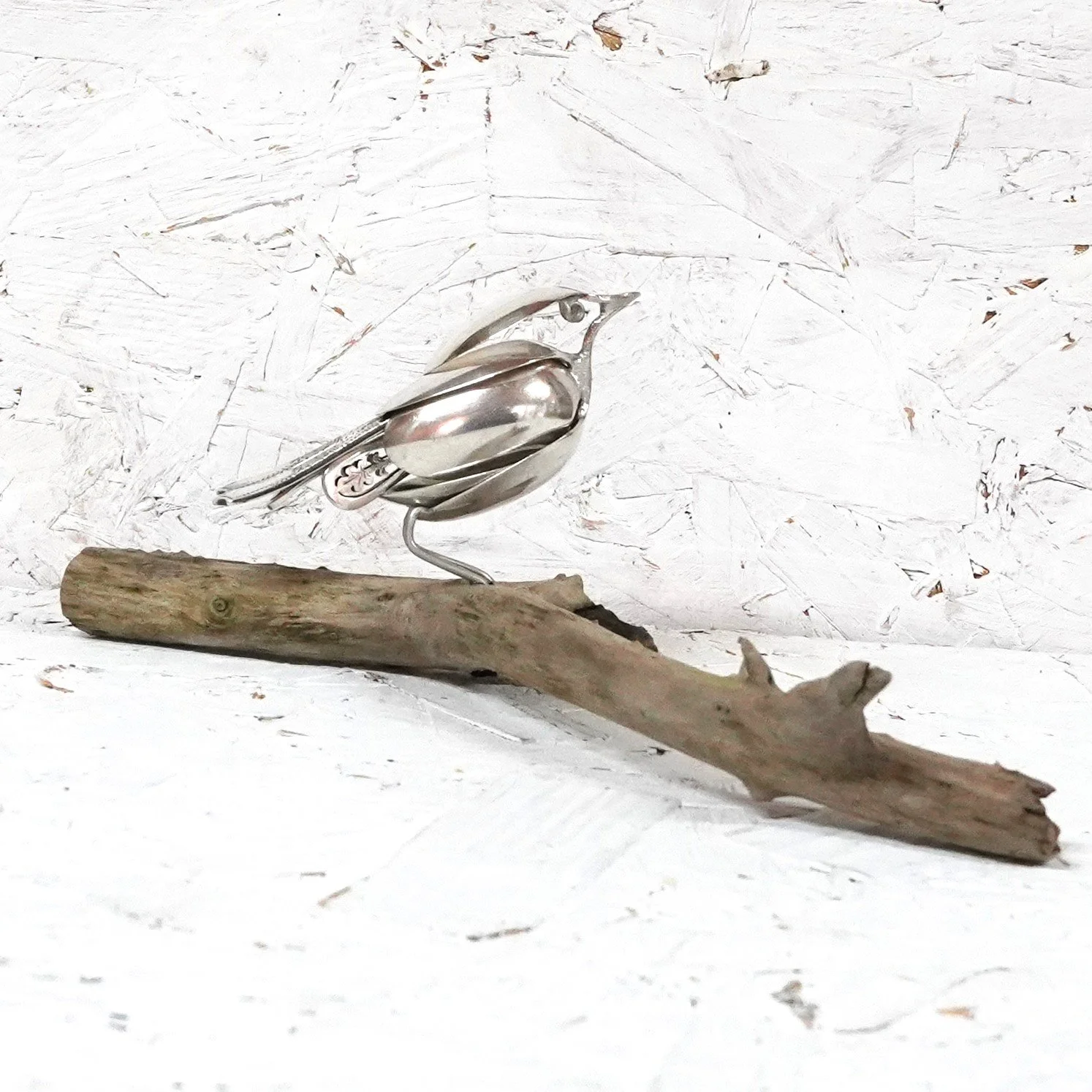 A robin created from epns vintage cutlery and mounted on a piece of driftwood.