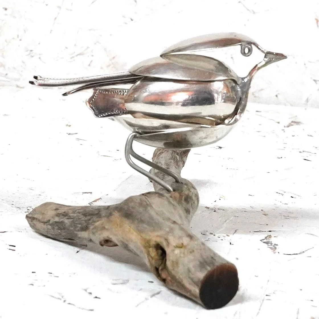 A great tit created from epns vintage cutlery and mounted on a piece of driftwood.