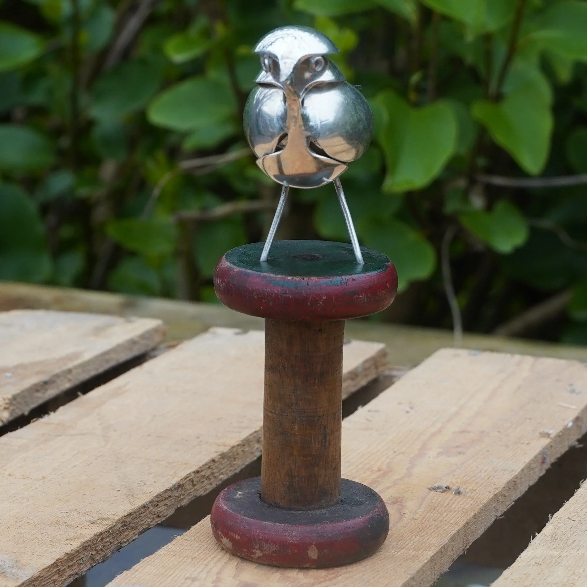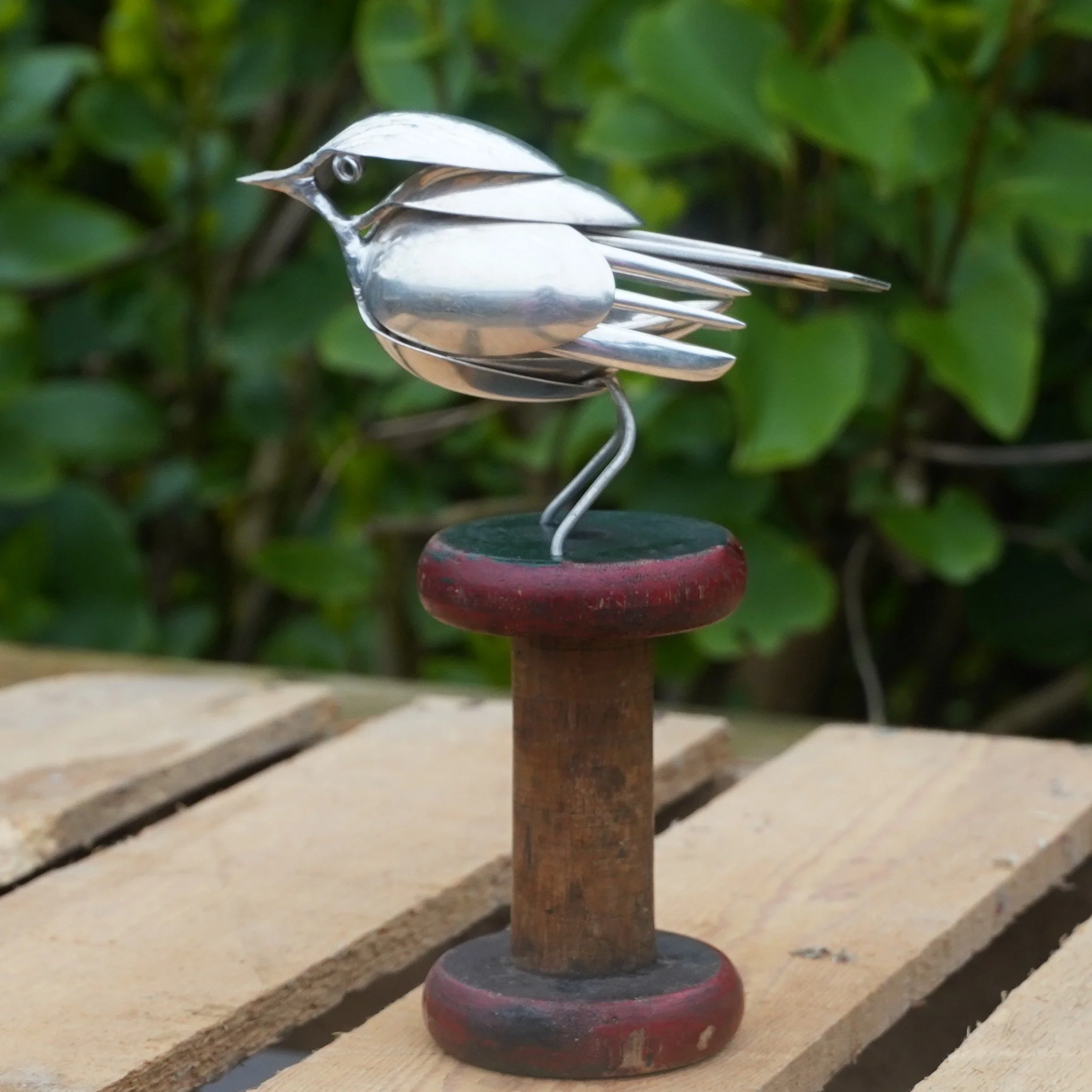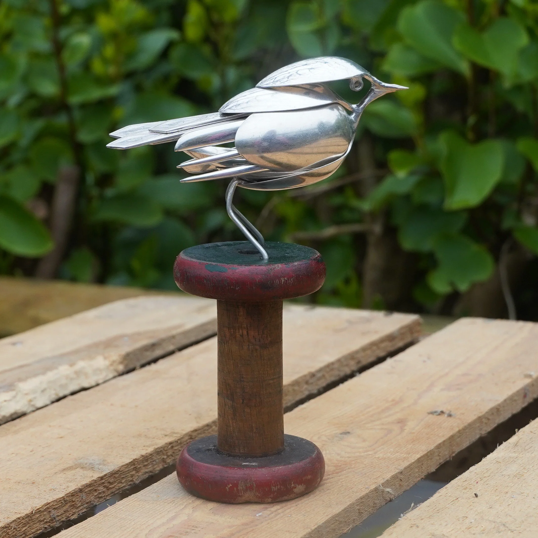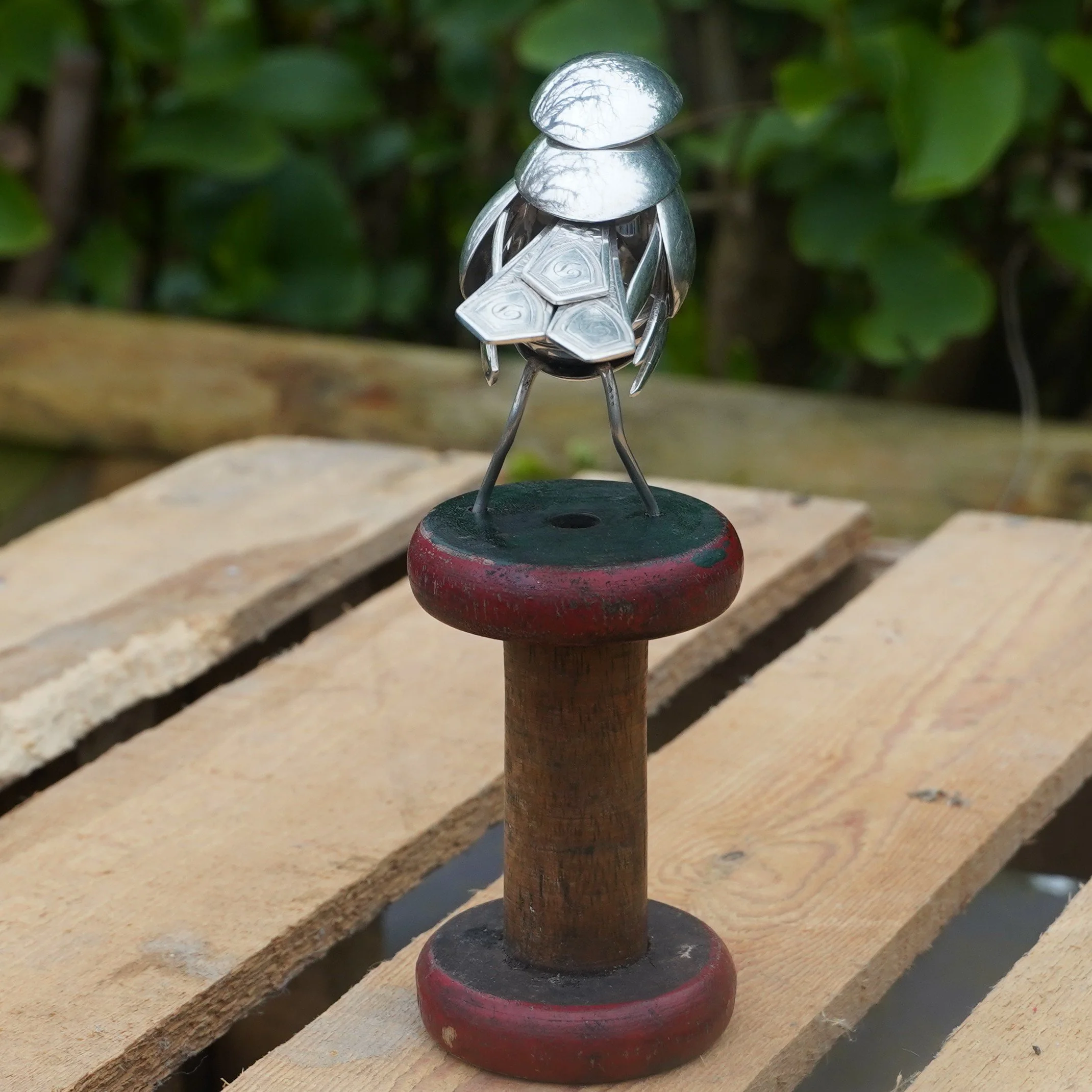 Robin created using epns / silver plated cutlery and mounted on a vintage bobbin