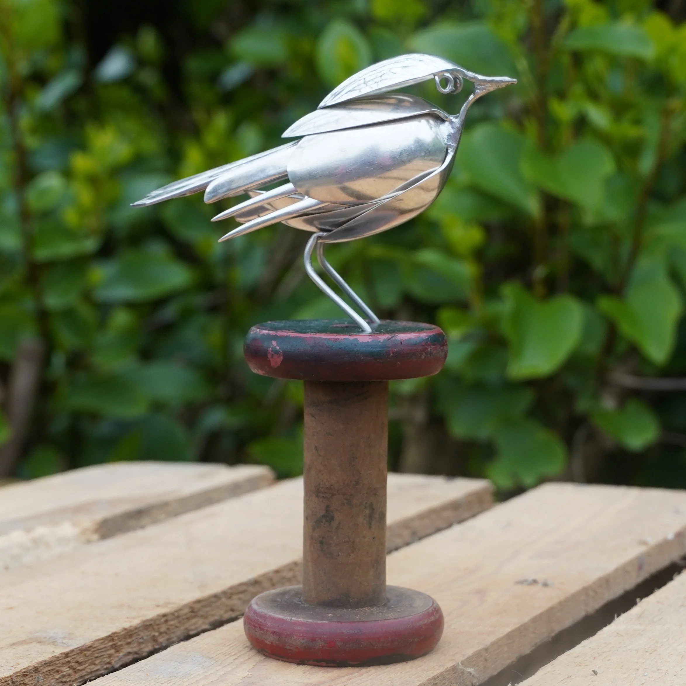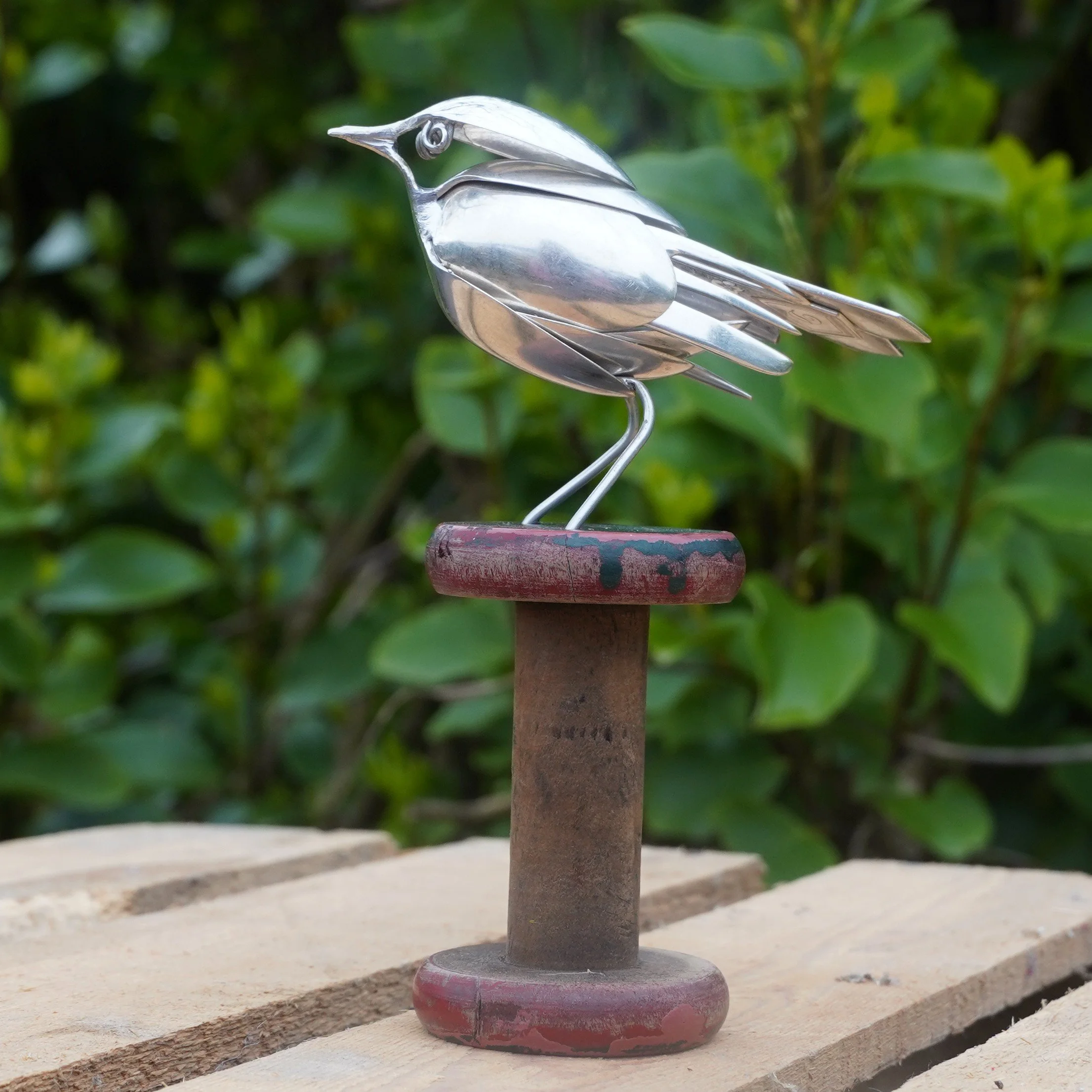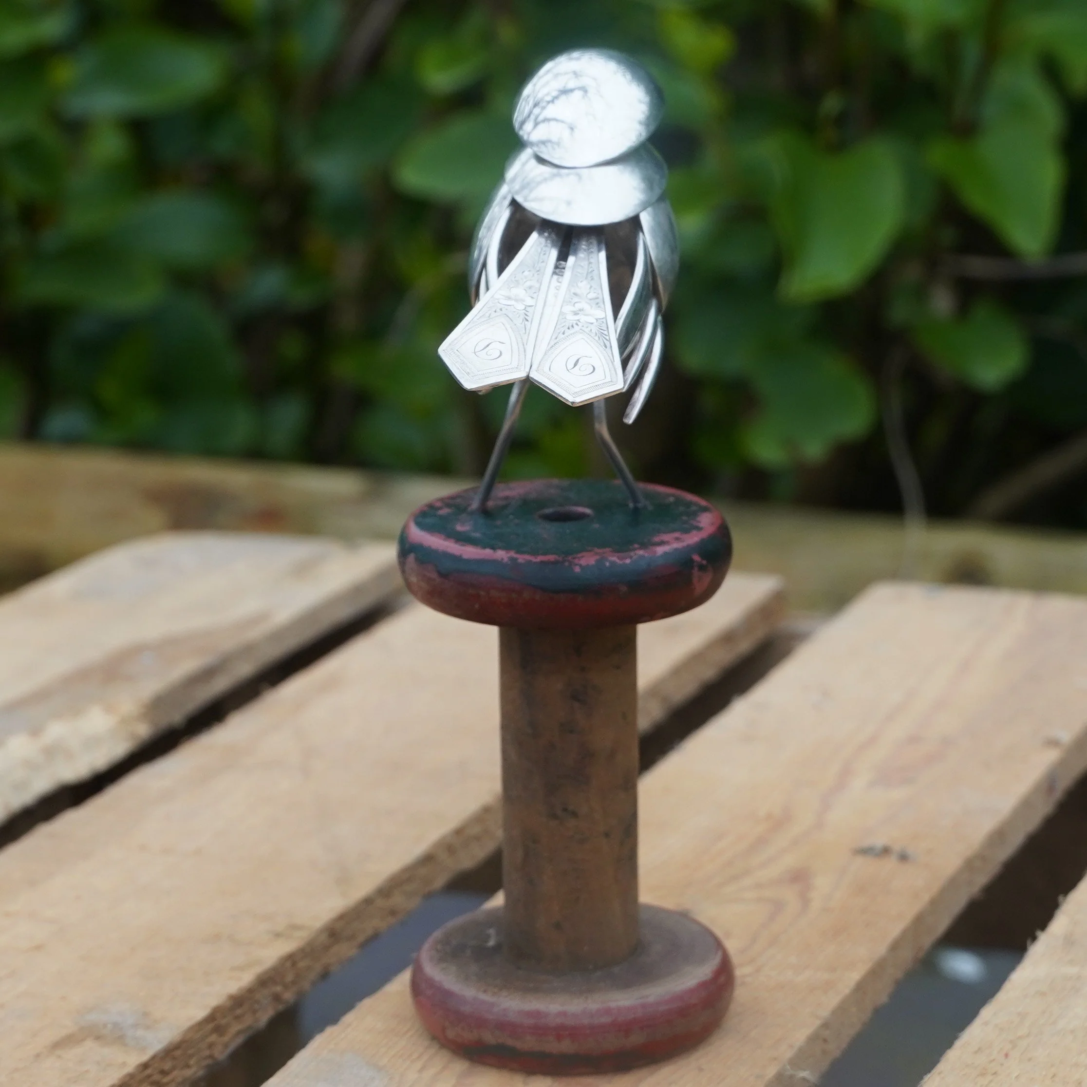 Robin created using epns / silver plated cutlery and mounted on a vintage bobbin